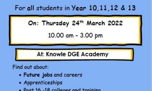 Please join us for the Learn@ MAT Career's Day, to be held at Knowle DGE, on Thursday 24th March, from 10am to 3pm. More information on the attachment below.